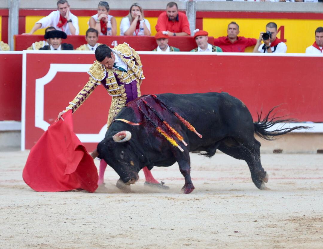 Pamplona ha celebrado su cuarta corrida de toros en San Fermín, en la que los diestros Sebastián Castella, Emilio de Justo y Borja Jiménez se midieron a los ejemplares de la ganadería de Victoriano del Río. Los animales presentaron teclas, pero pasando y dejándose llevar. Faltó chispa, aunque la excepción fue el cuarto. Castella desarrolló una faena larga y meritoria ante el primero, teniendo que llevarlo a base de oficio y mucha paciencia, logrando mayor acople por el izquierdo. El cuarto fue un toro entregado, con sus teclas según avanzaba la faena, pero que le permitió a Castella hacer su labor y culminar con ese toreo de cercanías tan característico. Emilio de Justo buscó las opciones a un segundo al que le faltó emoción y entrega en sus embestidas. Se vino a menos su faena ante el quinto, con el que al principio cuajó algún que otro muletazo sobre el derecho. Borja desarrolló una faena de inicio explosivo que poco a poco se fue apagando, lo que redujo sus posibilidades de triunfos. Entrega y determinación mostró ante el sexto, un toro que se movió, aunque con salidas bruscas. A pesar de ello, el sevillano tuvo matices con el sexto.