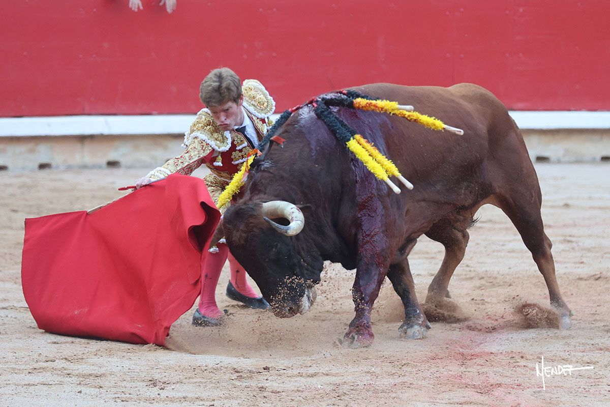 Salió el primero de la tarde, un toro al que saludó Castella, primero con una brega llevada para sacarlo del tercio y siguiendo por verónicas, remarando con dos medias muy toreras. El tercio de banderillas fue largo y laborioso. Se alcanzó la faena de muleta, que Castella comenzó con un ligero tanteo con el que tiró del animal para después asentarse con el y llevarlo con suavidad. Siguió con un toreo al natural de toque firme y arrastarlo detrás de la tela. El animal seguía el engaño con cierto ritmo, pero sin ser demasiado pulcro en sus embestidas. Cambió al derecho, encontrando brusquedad, pasaba sin entregarse, pensándolo mucho. Castella le robó los pases con mucho mérito, cambiando de nuevo al natural para desarrollar una tanta breve. Se encontró con el en aquellas series al natural lentas y de calado. Lo acabo metiendo, imponiéndose, sacando las virtudes de un toro que le presentó teclas y del que aprovechó su nobleza. Se tiró muy recto, siendo golpeado al primer intento y pinchando en numerosos intentos.