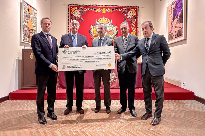 El salón de Carteles de la Real Maestranza de Caballería de Sevilla ha acogido a primera hora de este martes el acto de entrega del donativo de los beneficios del festival taurino celebrado el pasado 13 de octubre. El acto ha sido presidido por Marcelo Maestre, Teniente de Hermano Mayor de la Real Maestranza; Ramón Valencia Pastor, gerente de la empresa Pagés; José García Rodríguez, representante de la Hermandad de San Bernardo; Juan Cruzado Candau, representante de la Hermandad del Amor, y Manuel Vázquez, coordinador de la organización del festival.