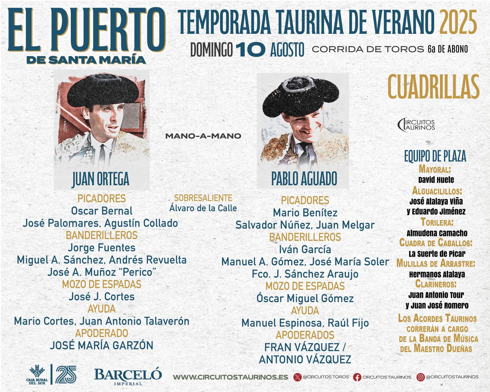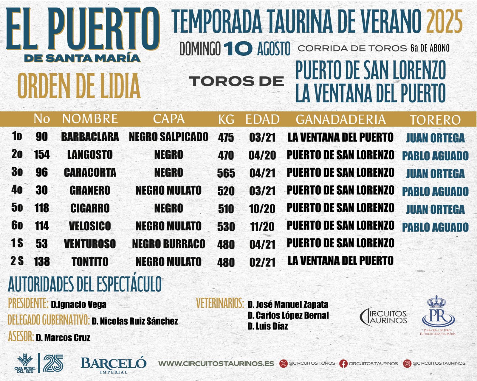 Los toros de Puerto de San Lorenzo y La Ventana del Puerto que se lidiarán esta tarde en el último festejo de la Temporada de Verano dd El Puerto de Santa María, ya han sido sorteados en los corrales de la Plaza Real. Juan Ortega y Pablo Aguado los lidiarán, mano a mano, esta tarde a partir de las 20.00 horas. El primer sobrero pertenece a la ganadería de El Puerto de San Lorenzo y el segundo lleva el hierro de La Ventana. El sobresaliente del espectáculo será el matador de toros Álvaro de la Calle. Este es el orden de lidia y la relación completa de cuadrillas y autoridades que regirán el espectáculo: