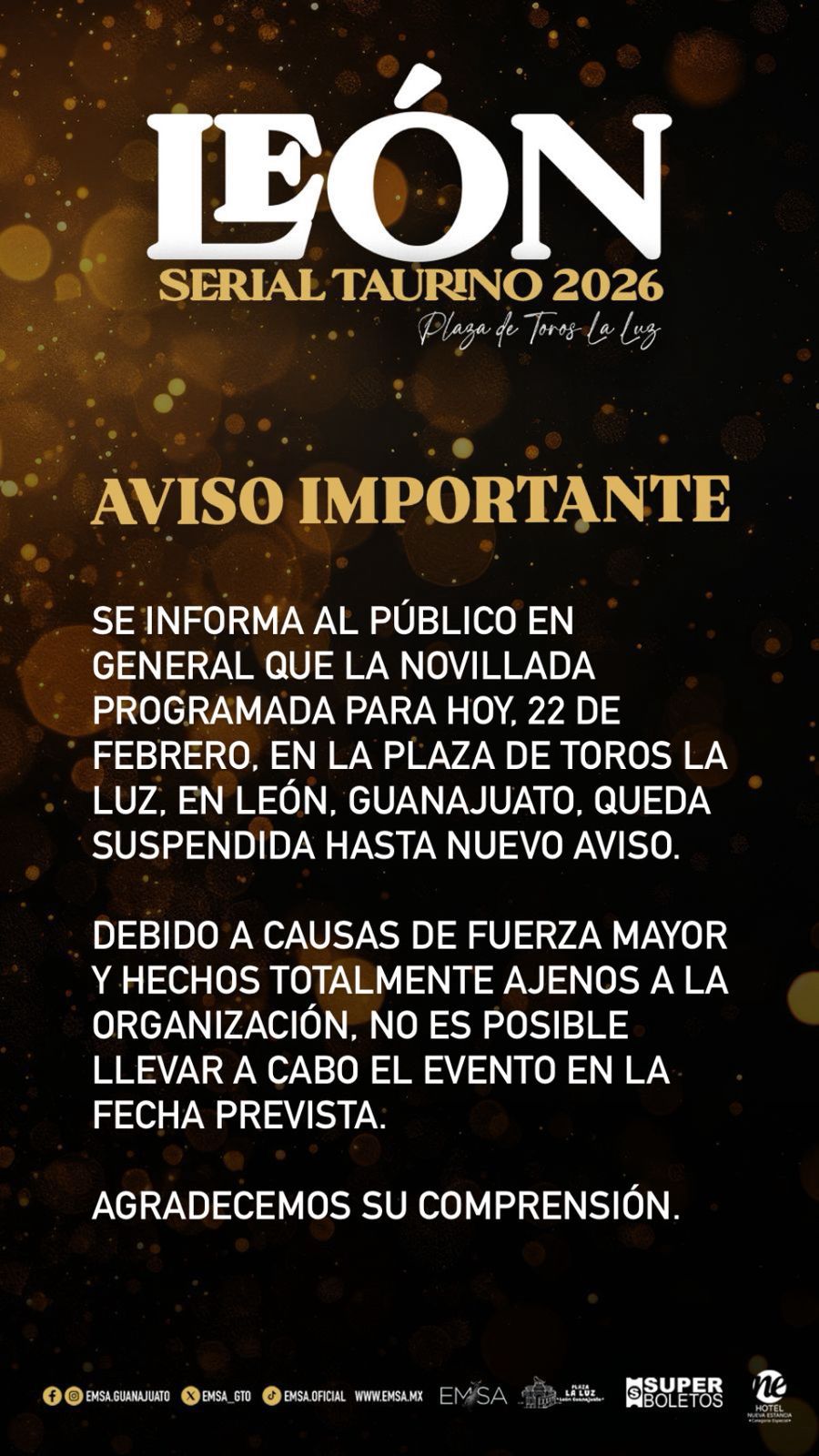 Debido a la ola de inseguridad que se está viviendo en estos momentos en varios estados de México, se han activado los protocolos correspondientes por lo que se han suspendido los eventos masivos en Guanajuato, por lo que la empresa EMSA ha anunciado, que la novillada programada el día de hoy queda cancelada, en la que se lidiarían novillos de El Garambullo para Emilio Ricaud, Luis Fernando Gaona, Cristóbal Arenas “El Maletilla”.