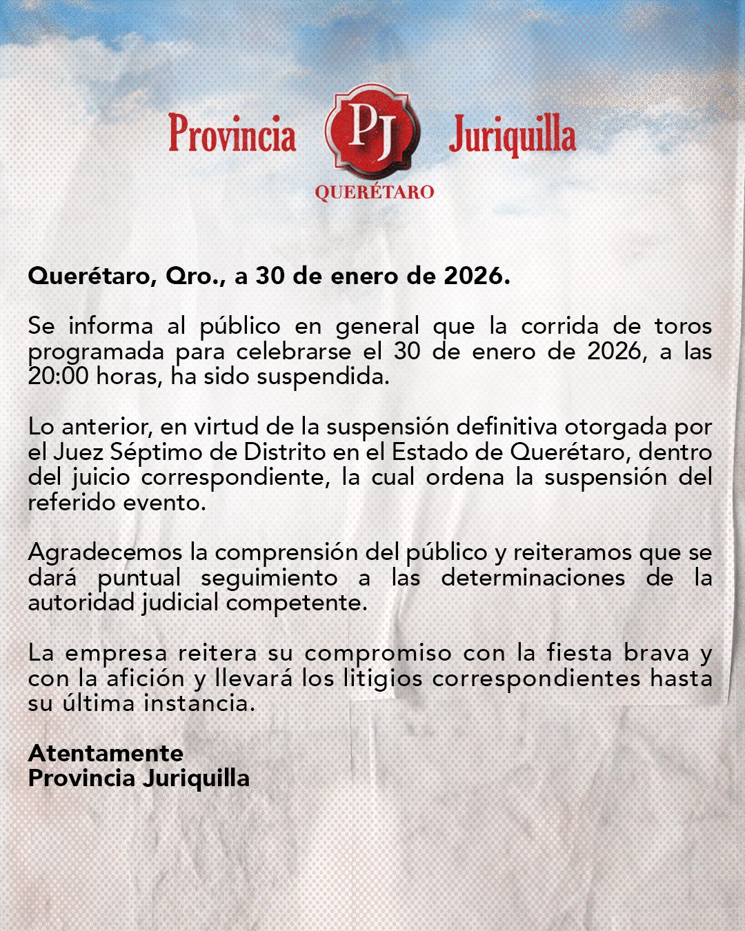 “El Municipio de Querétaro informa que fue notificado por el Juzgado Séptimo de Distrito en Materia de Amparo Civil, Administrativo y de Trabajo y de Juicios Federales en el Estado de Querétaro de una resolución emitida por la vía incidental, mediante la cual se ordena suspender eventos en los que exista maltrato animal, en específico la corrida de toros anunciada para realizarse el próximo 30 de enero de 2026 en la zona de Juriquilla”.