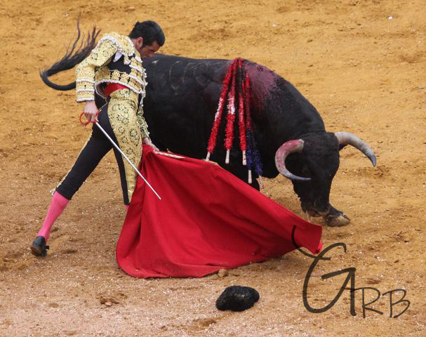 El quinto de la tarde era un precioso chorreado que salió con pies, al que el maestro le propino un precioso ramillete de verónicas que fue rematado con una media. Es muy jaleado en el galleo por chicuelinas con el que llevó al toro al caballo. El astado recibió un buen puyazo en el sitio. El quite por verónicas fue también algo que destacar. Los toreros de plata realizaron un tercio de banderillas lucido, saliendo trastabillado el banderillero en el último par golpeándose con el burladero en la cabeza sin más consecuencias. La faena de muleta empezó con la mano derecha, calando en el público, que estaba enardecido. Emilio de Justo estaba decidido y domeñó la embestida del toro con los vuelos de la muleta. Los pases eran largos, profundos, rotundos, de adelante hasta atrás de la cadera. El toreo más caro. Da una última serie pasándose al toro muy cerca, pero cuando muchos pensaban que iba a cortar otras dos orejas, en dos entradas haciendo la suerte como mandan los cánones pinchó en lo alto, teniendo que entrar una tercera para cobrar una estocada entera.