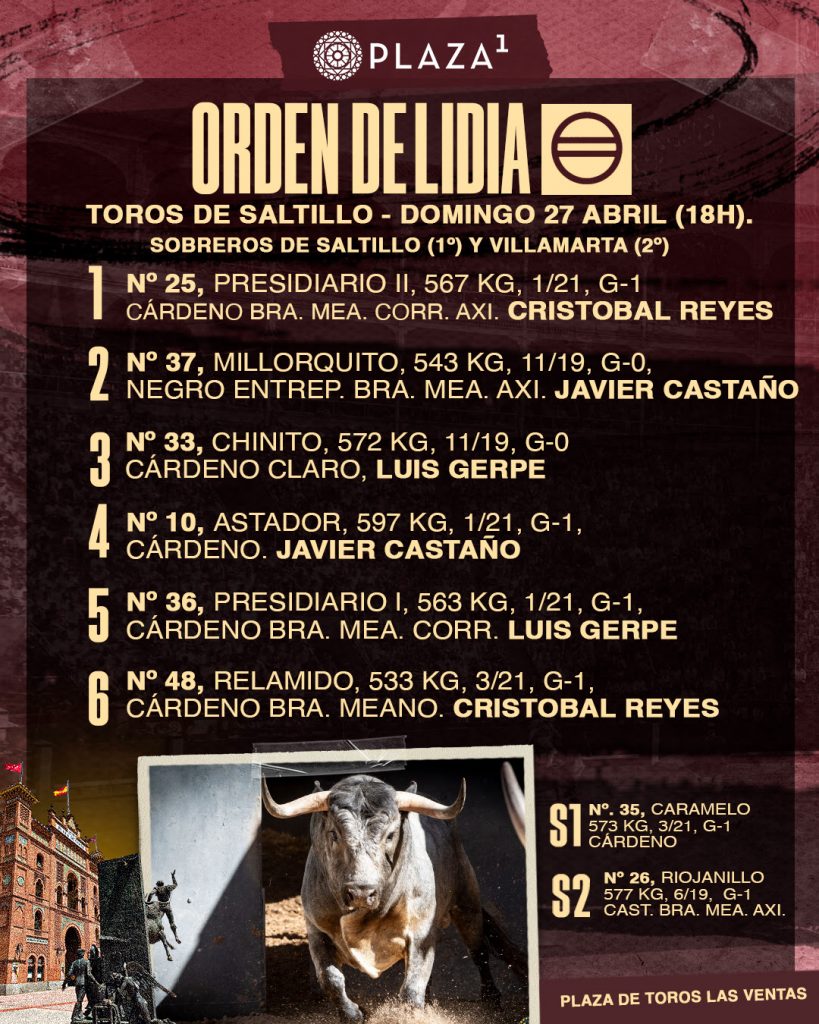 Seis toros de Saltillo ya ha sido sorteados y enchiquerados en la Plaza de Toros de Las Ventas para el último festejo del mes de abril. A las 18:00h. los lidiarán Javier Castaño, Luis Gerpe y Cristóbal Reyes, que confirma alternativa.