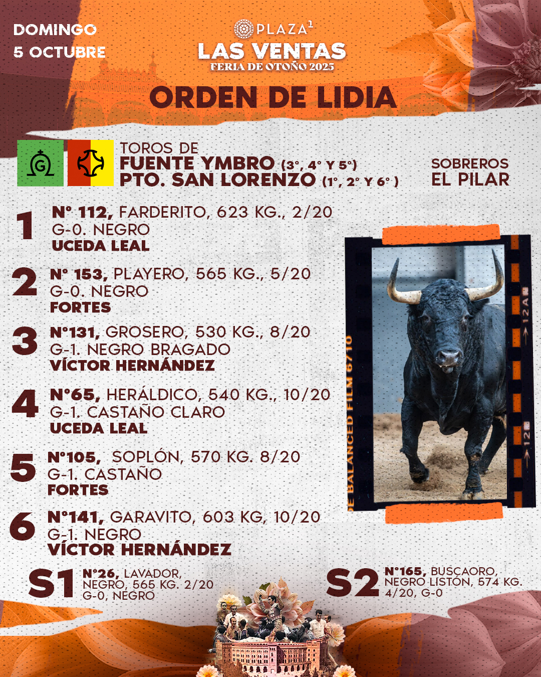 Ya han sido sorteados y enchiquerdos tres toros de Puerto de San Lorenzo (1º, 2º y 6º) y tres de Fuente Ymbro (3º, 4º y 5º) para la cuarta cita de la Feria de Otoño. Esta tarde, en la Plaza de Toros de Las Ventas, a las 18h. harán el paseíllo Uceda Leal, Fortes y Víctor Hernández