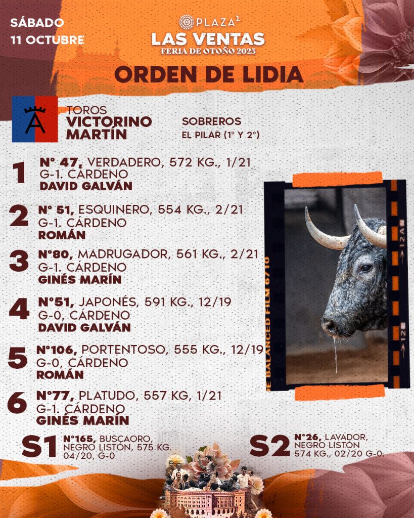 Seis toros de la divisa de Victorino Martín aguardan ya en los corrales de la Plaza de Toros de Las Ventas para la séptima cita de la Feria de Otoño. Esta tarde, a las 18h., serán lidiados por David Galván, Román y Ginés Marín.