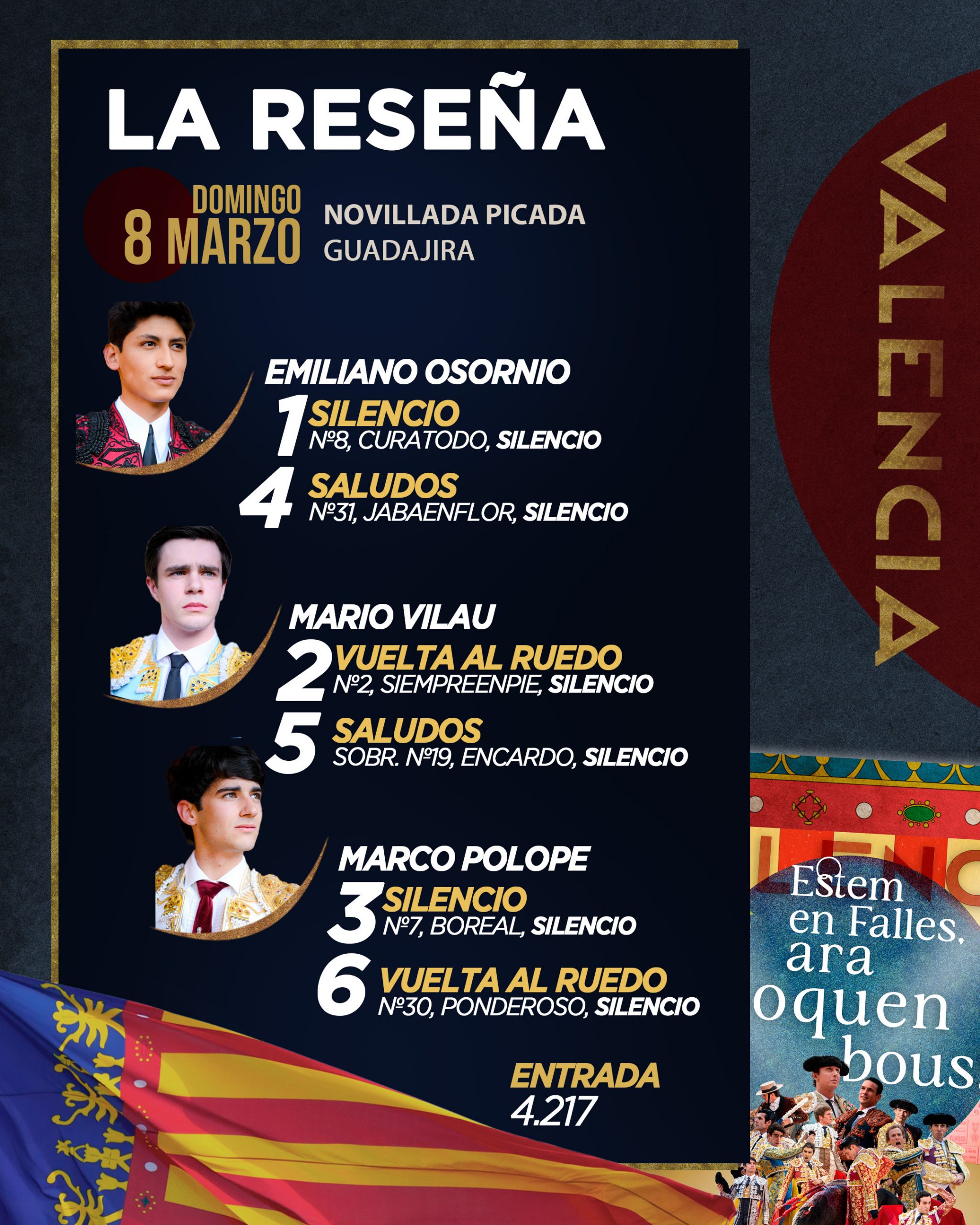 Mario Vilau y Marco Polope han dado una vuelta al ruedo en la novillada con picadores lidiada este domingo en la Plaza de Toros de Valencia. Segundo festejo de abono de la Feria Taurina de Fallas condicionado por el escaso juego de los novillos de Guadajira. Completó el cartel Emiliano Osornio, que saludó desde el tercio con el segundo de su lote, ya que con el primero no tuvo opciones. No le prestó la clase necesaria que le permitiera al mexicano la expresión y poder desarrollar una faena completa. A pesar de ello, y ante la frialdad del respetable hacia el novillero, pudo mostrar su amplia capacidad en la cara del animal a base de torería y clase